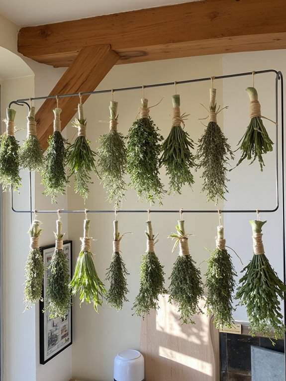 Proper installation near a window ensures adequate airflow, while maintaining distance between herb bundles prevents moisture-related issues. Using twine or clips to suspend herbs upside down allows for optimal drying over 1-2 weeks, after which the dried herbs can be stored in dated, airtight containers for future use.