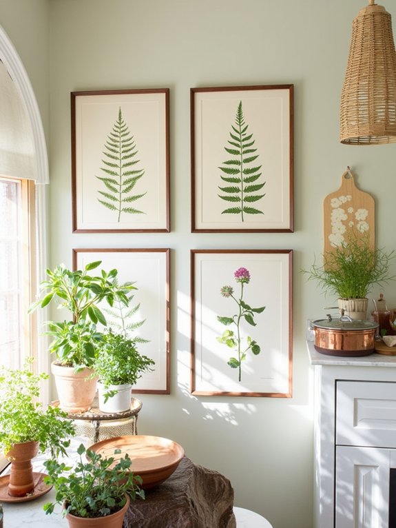 Botanical wall art collections feature elegant floral imagery and vintage-inspired illustrations that bring natural beauty to kitchen spaces. The designs showcase herbs, flowers, and fruits in various frame options, from metallic finishes to rustic wood styles.