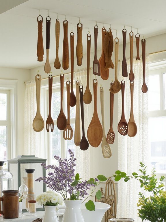 The display features a mix of handmade and antique wooden utensils hung on small hooks or copper nails, grouped in complementary clusters. This arrangement not only adds visual interest to the kitchen space but also keeps essential cooking tools easily accessible while celebrating traditional farmhouse aesthetics.