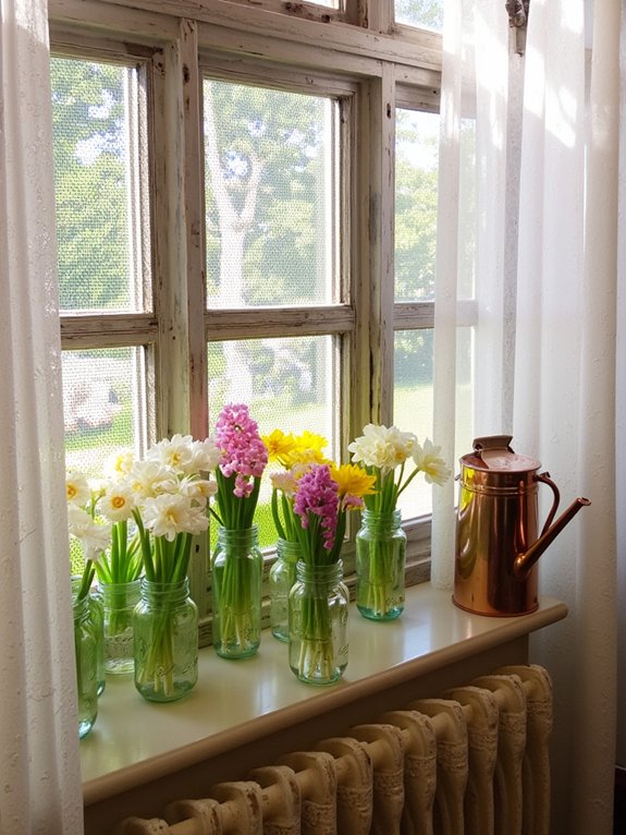 Placing fresh spring flowers on kitchen windowsills creates a natural bridge between indoor cooking spaces and garden views outside. These simple floral arrangements bring seasonal color and life directly into food preparation areas while maximizing natural light and window functionality.