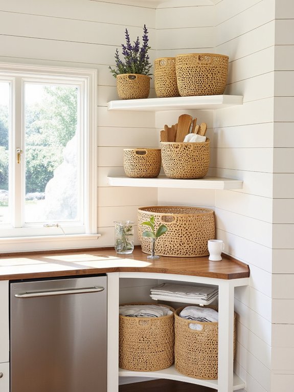 Natural woven rattan storage baskets combine functionality with rustic charm, bringing organization and warmth to kitchen spaces. Available in various sizes from 8 to 20 inches wide, these versatile containers feature tight weaves and reinforced handles for lasting durability.