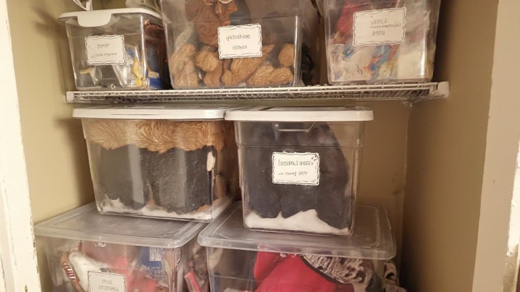 To make retrieval effortless, attach clear, easy-to-read labels to each bin, either by using a label maker or printable tags, specifying the contents inside. Place frequently used bins on lower shelves for quick access, while storing less-used or seasonal items higher up to maximize vertical space. This simple system not only keeps your coat closet tidy but also saves time when you’re searching for specific items.