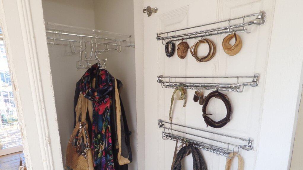 Pull-out racks are an excellent addition to a coat closet, maximizing space and improving accessibility for items that are often hard to reach. These racks can be installed on the sides or back of the closet to store accessories like scarves, belts, or even hats, keeping them neatly organized and easy to grab. Choose racks with adjustable heights to accommodate different items and guarantee they fit seamlessly into your closet’s layout.