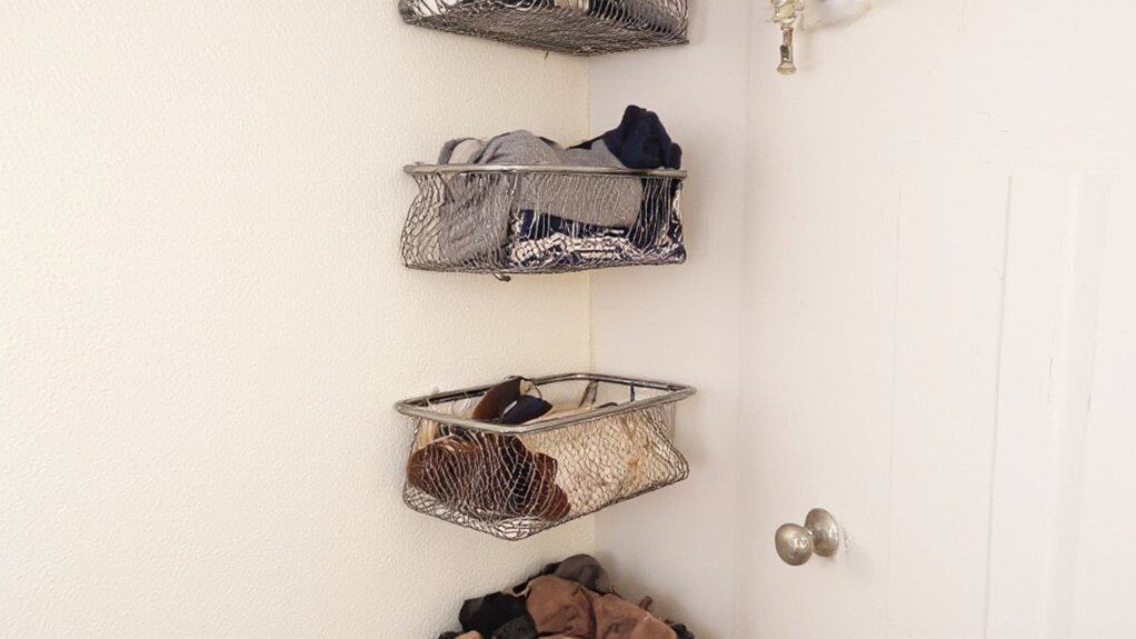 Mounting wall-mounted baskets in a coat closet is a practical way to maximize vertical space and keep smaller items tidy. Begin by selecting a suitable spot on the closet wall, guaranteeing it’s accessible and doesn’t interfere with hanging coats or other stored items. Use a stud finder to locate secure points for mounting, and install the baskets with appropriate hardware, like screws or wall anchors, to make sure they can hold the weight of the items you plan to store.