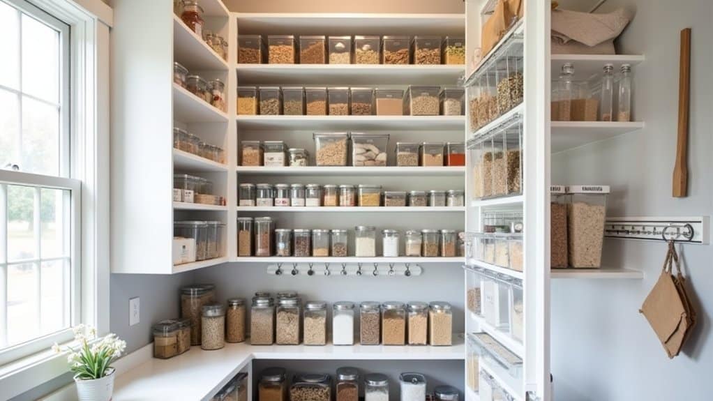 Maximizing vertical space in your pantry is a game-changer for creating a more functional and accessible storage area, especially when working with a small space or a tight budget. By utilizing the often-underused height of your pantry, you can greatly increase storage capacity, reduce clutter on lower shelves, and make items easier to find. This approach not only helps keep your pantry neat and organized but also saves time during meal prep by guaranteeing everything has a designated spot, ultimately enhancing your daily kitchen routine.