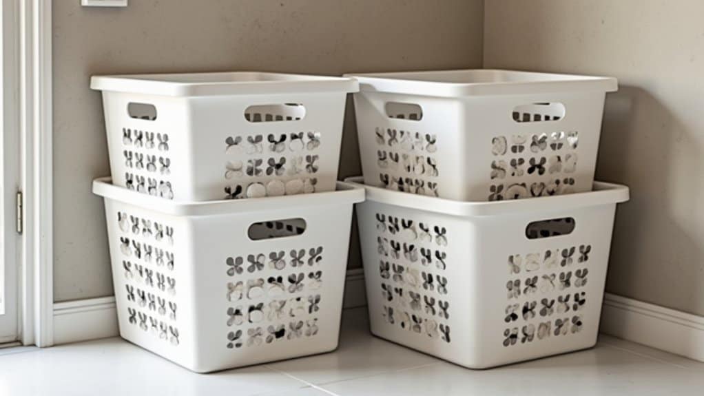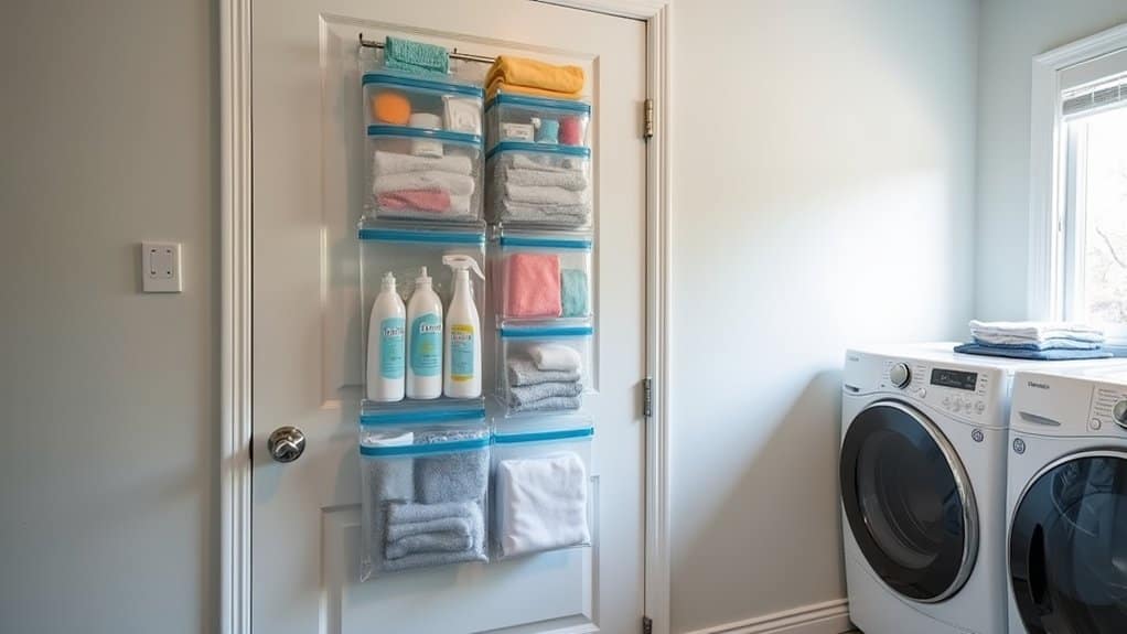 To implement over-door storage, start by selecting sturdy, adjustable organizers or hooks that fit your door’s dimensions and can handle the weight of the items you plan to store. Consider using clear or labeled bins within the organizers to easily identify contents like dryer sheets, stain removers, or spare rags. Ascertain the door can still open and close smoothly, and avoid overloading it to prevent damage to the hinges or the door itself.