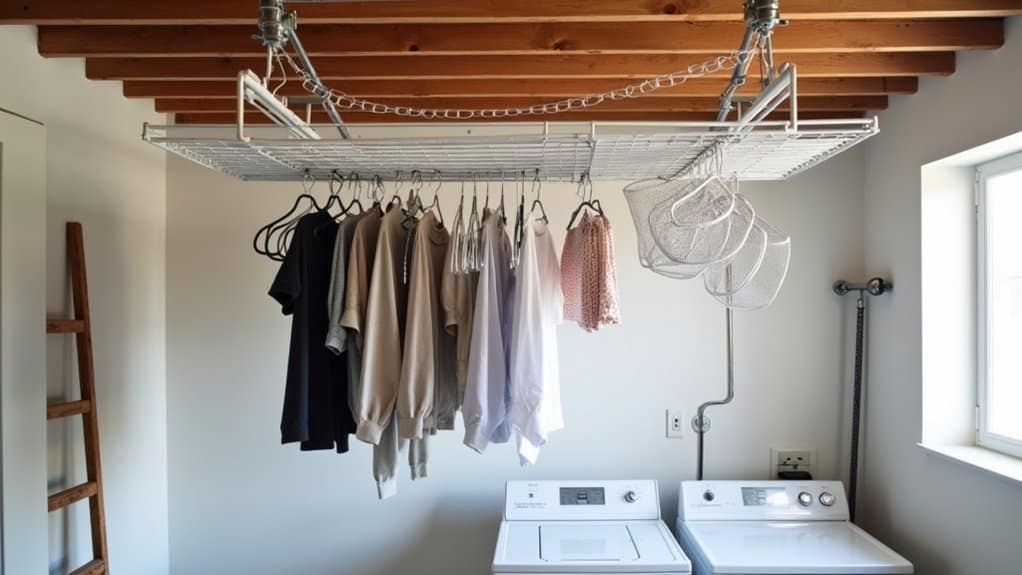 To organize with a ceiling-mounted rack, start by categorizing items like laundry baskets, drying clothes, or seasonal linens that can be stored overhead. Use labeled bins or baskets to separate items for easy access, and verify the rack is securely anchored to the ceiling joists to handle the weight. Regularly check the rack for stability and avoid overloading it to prevent accidents or damage.