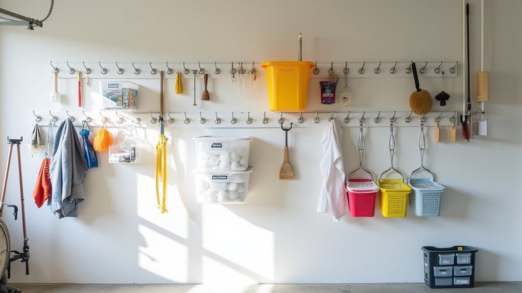 Pegboard accessory hooks are an excellent way to maximize storage in a garage laundry room by utilizing vertical wall space. These hooks can be easily inserted into a pegboard, allowing you to hang a variety of items such as cleaning supplies, laundry baskets, or even small tools. The flexibility of repositioning hooks guarantees that you can adapt the layout to fit changing storage needs over time.