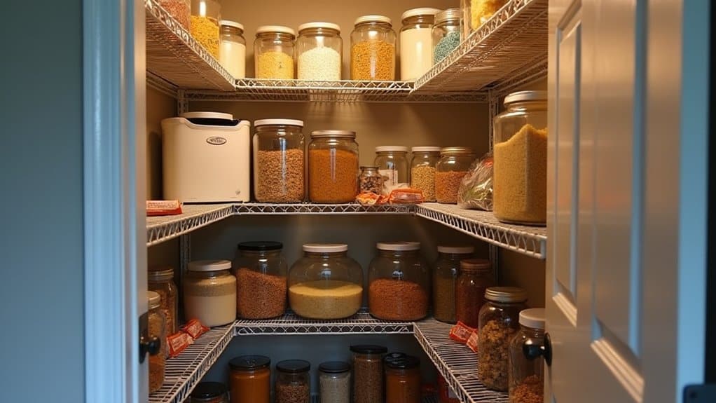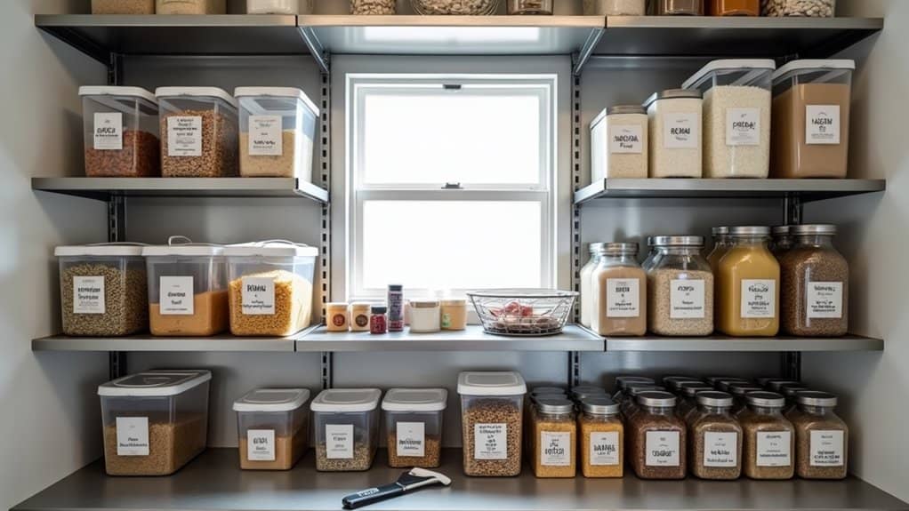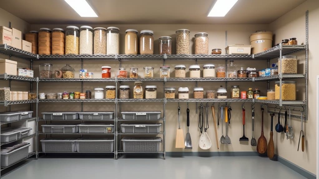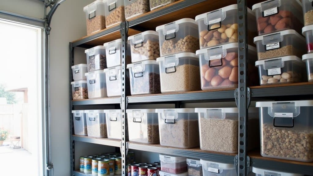 Once you’ve gathered this information, prioritize safety and practicality in your planning. Confirm that heavy items will be stored low to the ground to prevent accidents, and avoid overloading shelves in areas prone to clutter or instability. Check for proper lighting in the garage, as a well-lit space makes it easier to locate items and maintain organization. If your garage lacks insulation or climate control, consider investing in sealed containers or insulated storage solutions to protect food from pests and extreme temperatures. By thoroughly reviewing your garage space, you’ll create a solid foundation for an efficient and durable pantry storage system.