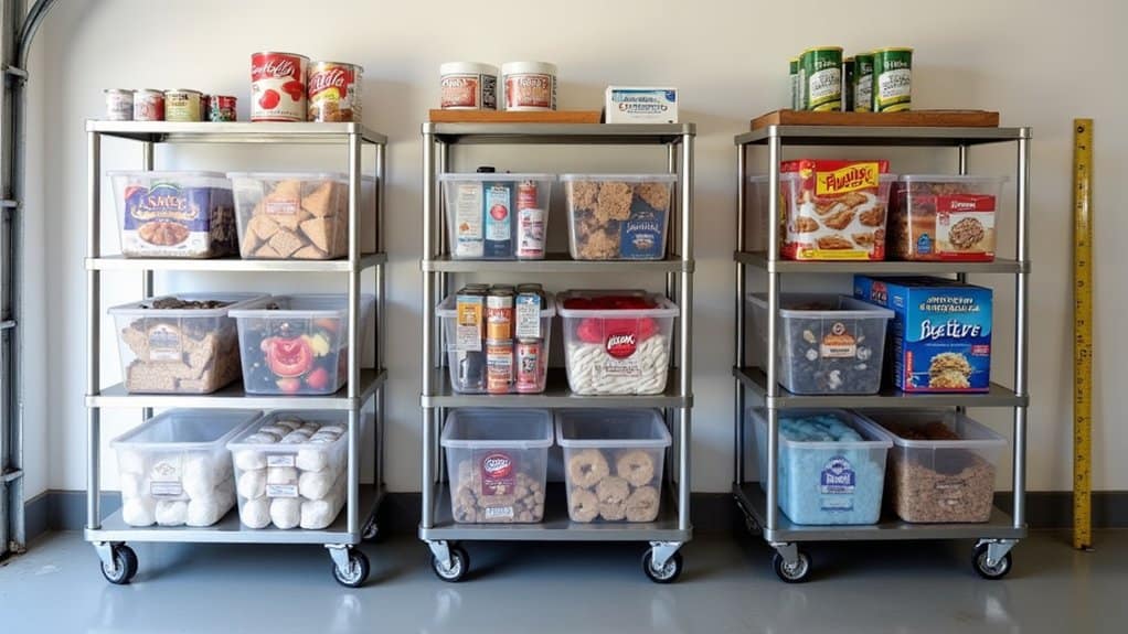 Rolling carts are an excellent solution for maximizing floor space in a garage pantry, offering both mobility and versatility. These carts can be easily moved to access items or repositioned based on your workflow, making them ideal for tight spaces. Opt for carts with multiple tiers to store a variety of goods, such as canned foods, cleaning supplies, or bulk snacks, while keeping everything visible and accessible. Ascertain the cart has sturdy wheels with locking mechanisms to secure it in place when needed, preventing unwanted movement on uneven garage floors.