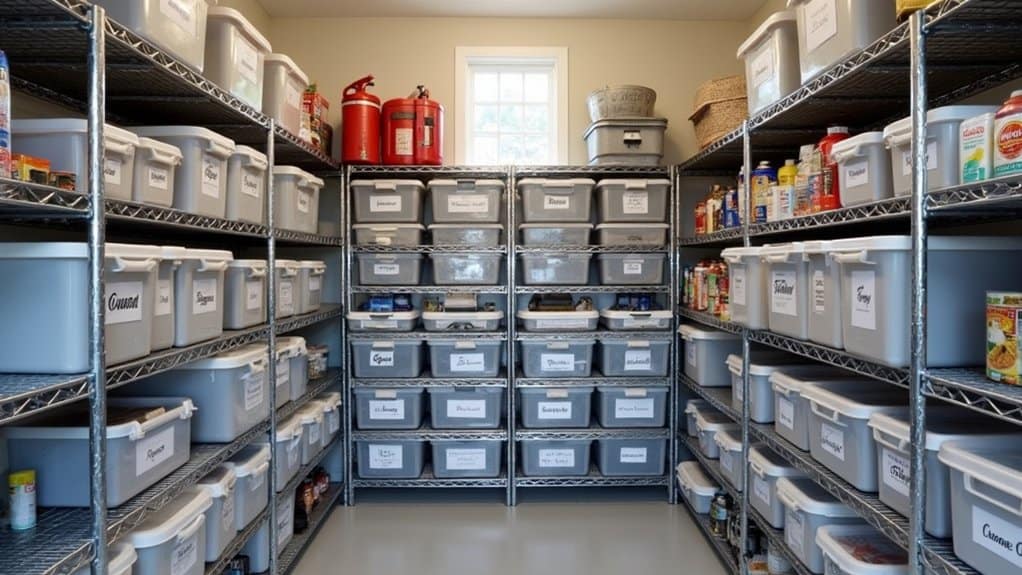 To further enhance organization, consider using storage solutions like bins, baskets, or clear containers within each zone to keep smaller items contained and visible. For example, dedicate a bin for canned goods in the food zone and another for paper products in the household zone. Guarantee that hazardous materials, such as cleaning chemicals, are stored in a separate, secure area away from food and out of reach of children. Regularly review and rearrange these zones as your storage needs evolve to keep the system functional and clutter-free.