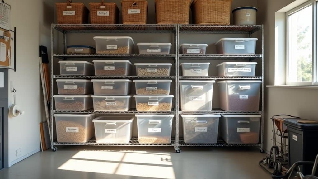 Stackable bins are an excellent solution for optimizing space and maintaining accessibility in a garage pantry. Start by selecting bins of varying sizes to accommodate different items, such as canned goods, snacks, or cleaning supplies, guaranteeing they are sturdy and preferably transparent for quick visibility. Place heavier items in the bottom bins to create a stable base, and stack lighter items on top to prevent tipping or overloading. Label each bin clearly with its contents to streamline the process of finding what you need without rummaging through multiple containers. Position the stackable bins on a sturdy shelf or directly on the floor, making sure they are easily reachable for daily use.