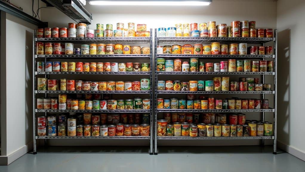Organizing canned goods with tiered storage is an efficient way to maximize space and keep your garage pantry neat and accessible. Start by selecting a sturdy tiered shelf or riser that fits your available space, guaranteeing it can support the weight of multiple cans. Place the tiered storage on a shelf or countertop in your garage pantry, ideally at eye level for easy visibility. Arrange the cans by type, such as vegetables, soups, or fruits, and stack them with the labels facing forward so you can quickly identify each item. For added organization, consider placing the most frequently used cans on the lower tiers for easy access, while reserving higher tiers for less-used items or bulk stock.