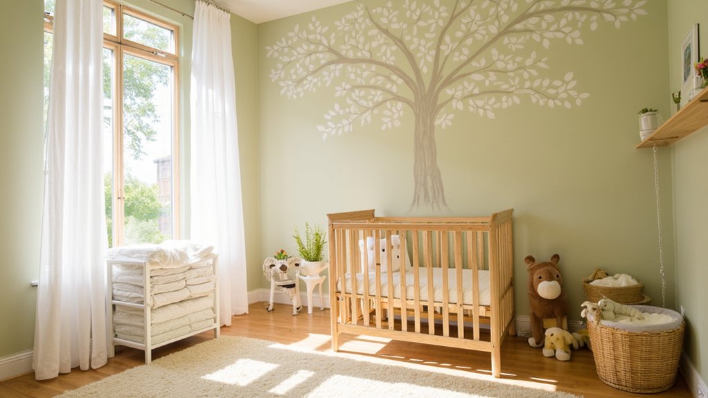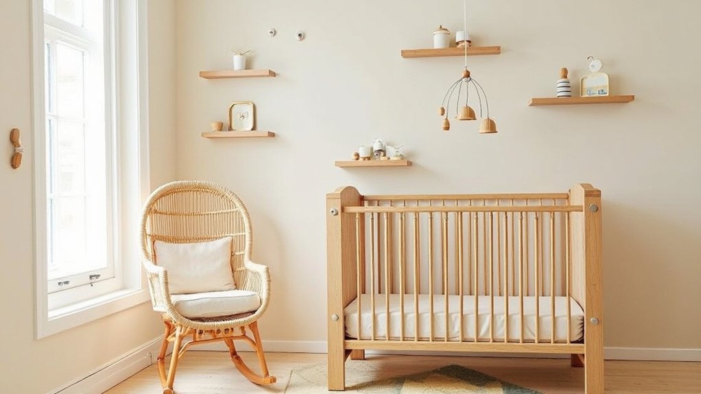 While designing a nursery, consider the eco-friendly charm of sustainable bamboo decor for a modern, gender-neutral look. You’re choosing a material that’s renewable, growing back in just 3-5 years, and incredibly durable for daily use. Incorporate bamboo cribs (standard 52”x28”) or shelving units to store toys neatly.