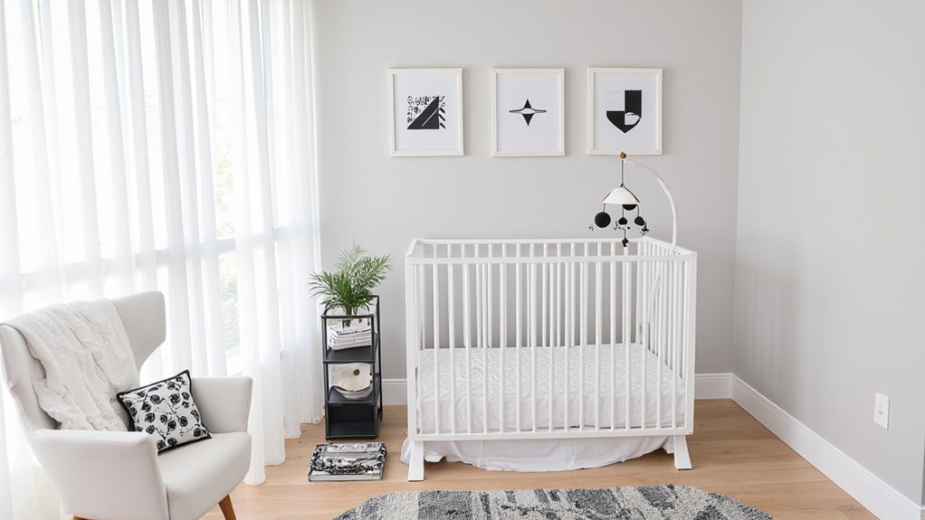 As you craft a stylish nursery, immerse yourself in the sleek world of modern monochrome accents for a timeless, gender-neutral vibe. Stick to black, white, and gray tones for a clean look that lasts. With thoughtful choices, you’ll create a chic space in just a weekend.