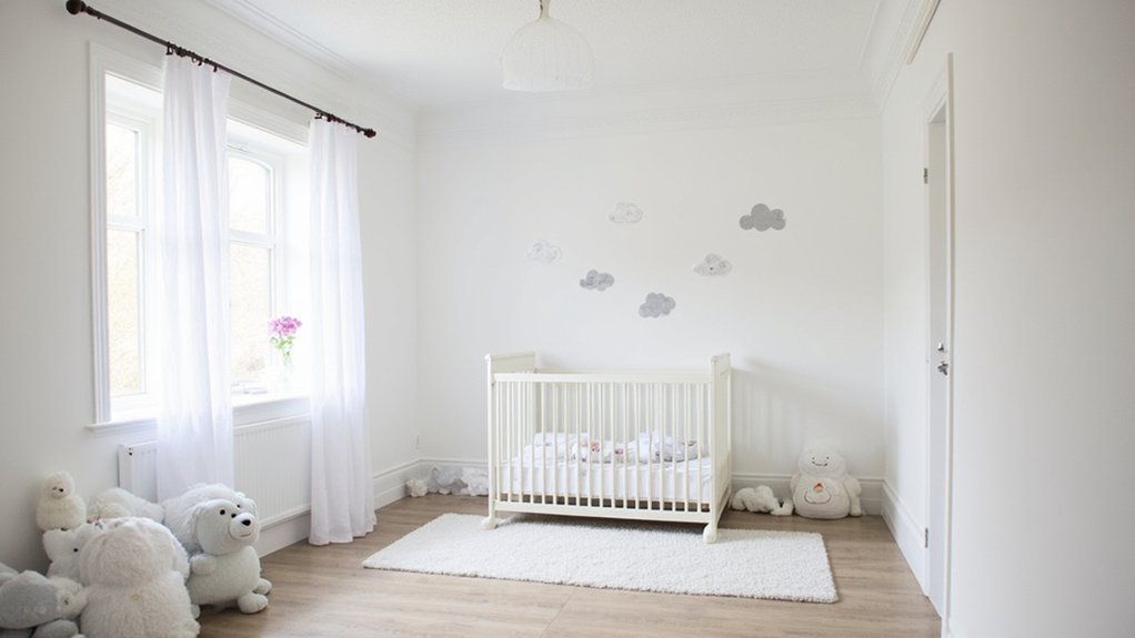 Create a serene atmosphere in your gender-neutral nursery by embracing Scandinavian cloud imagery for a fresh, airy feel. You’ll love how soft whites and grays mimic cloudy skies, bringing calm to the space. Start decorating with cloud-inspired elements to craft a dreamy vibe.