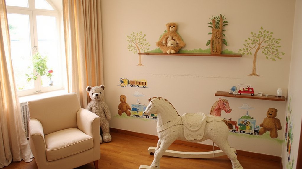 Nostalgia can transform a nursery into a timeless haven with vintage toy motifs. Imagine decorating with classic teddy bears or retro rocking horses to create a cozy, timeless vibe. You’ll craft a space that feels both playful and calming by blending old-school charm into your design.