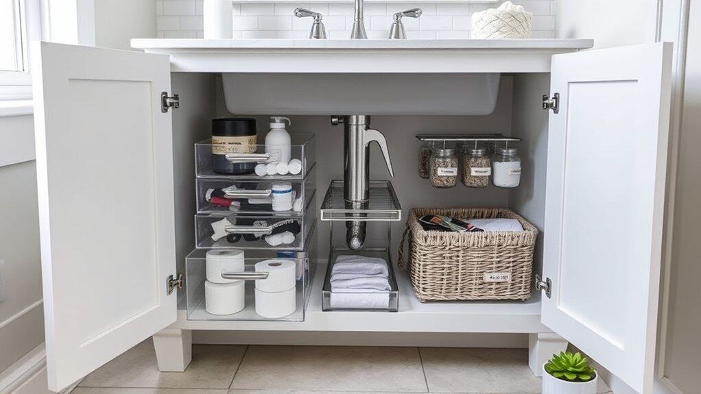 Creating distinct zones with clear storage containers transforms this chaotic space into an organized system where every item has its place. Clear containers not only protect the cabinet bottom from potential leaks but also allow you to quickly identify contents and monitor supply levels at a glance.