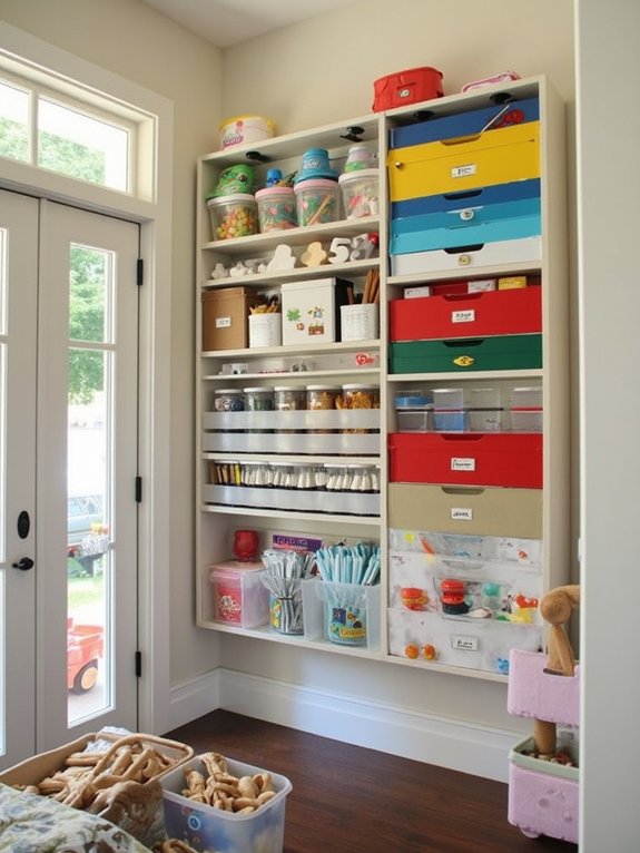 A magnetic board system offers versatile wall storage for children’s art supplies and toys while keeping items visible and accessible. By mounting the board at child-height, kids can independently organize and retrieve their belongings through magnetic hooks, containers, and clips.