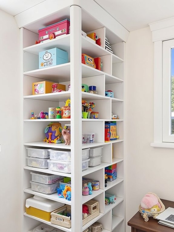 A corner toy tower system transforms unused corner space into a practical vertical storage solution. By installing floor-to-ceiling adjustable shelving units with 12-inch spacing, toys remain organized and easily accessible to children while maximizing available room space.