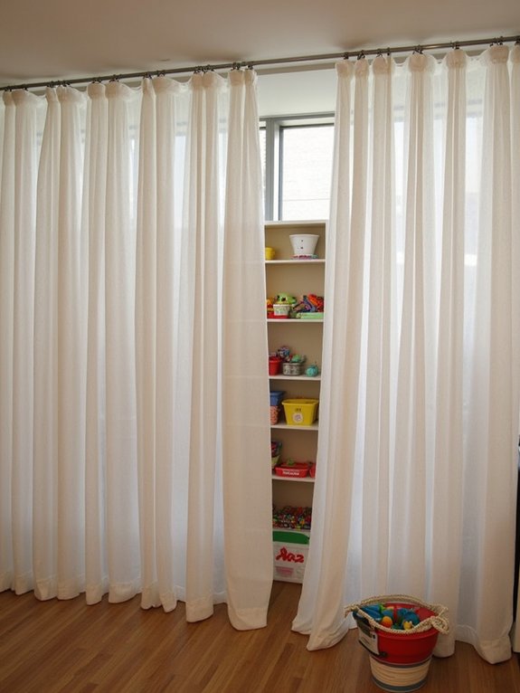Install simple curtains in front of toy shelves to instantly hide clutter and create a cleaner-looking playroom. Using tension rods mounted between shelf units provides a quick, damage-free solution for hanging lightweight curtains that children can easily manage.