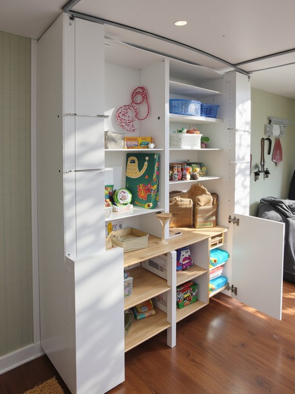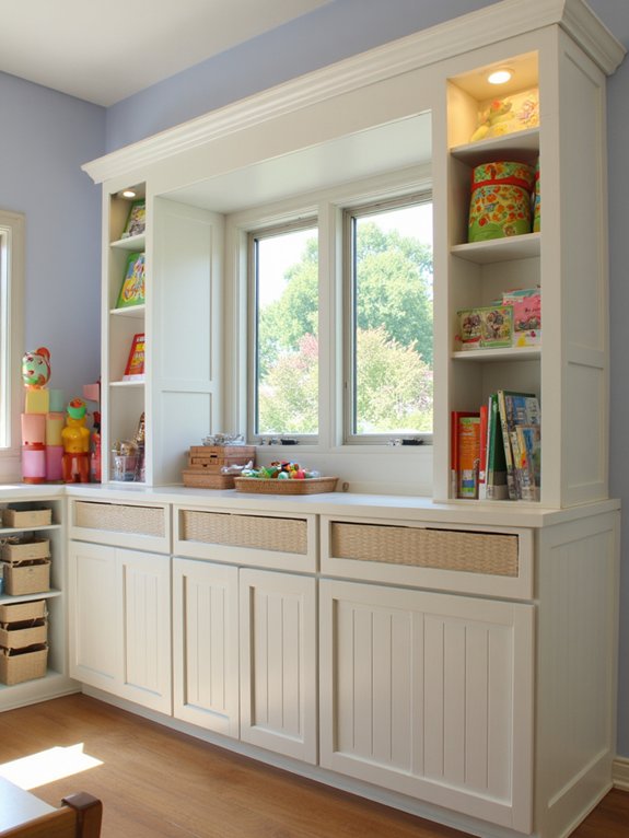 Choose machine-washable curtains that complement your room’s decor and extend slightly beyond the shelf edges for complete coverage. Adding tie-backs allows convenient access during play sessions while maintaining the option to quickly conceal toys when needed.