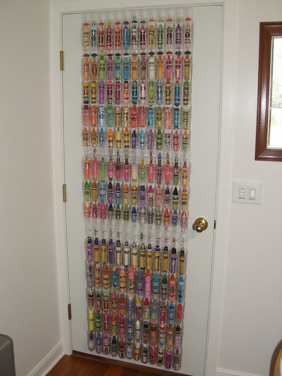 The holder can be secured with strong adhesive strips and organized by color families for easy use. Adding labels to each pocket helps with organization, while a small basket at the bottom collects broken pieces. This practical setup ensures crayons stay tidy and within reach for young artists.