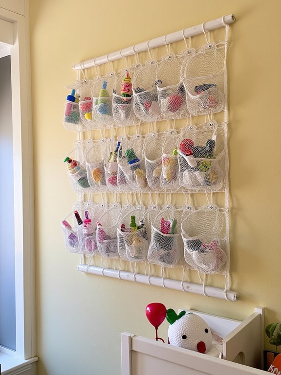 Hanging mesh organizers offer efficient vertical storage for playrooms without consuming valuable floor space. These versatile units feature durable mesh construction that keeps toys and supplies visible while keeping them contained and organized.