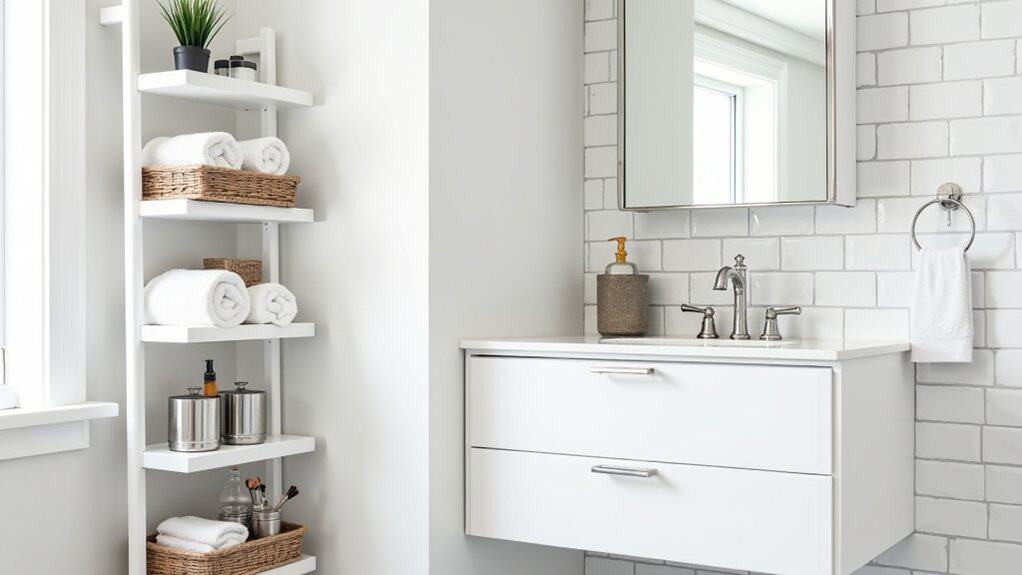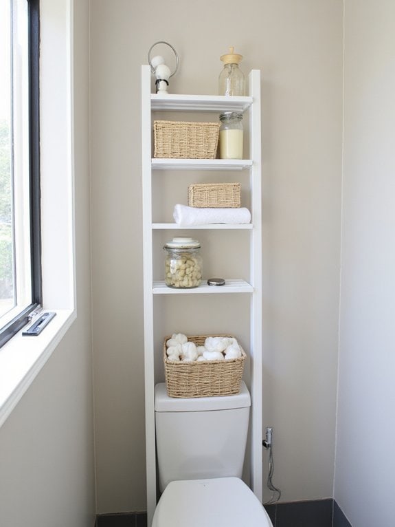 The versatility of ladder shelves extends to their style options, from rustic wood to modern finishes, allowing them to complement any bathroom décor. Their adaptable design supports various storage accessories like wire baskets and containers for efficient organization of smaller items, making the most of every shelf level.