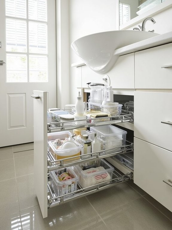 An under-sink pull-out drawer system converts unused cabinet space into efficient storage beneath your bathroom vanity. The sliding mechanism allows easy access to items stored in the back without having to remove everything in front.