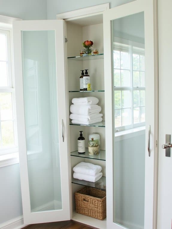 Glass door storage towers offer elegant protection and organization for bathroom essentials while keeping items visible yet dust-free. With their tempered glass doors and moisture-resistant construction, these units preserve and display toiletries beautifully.