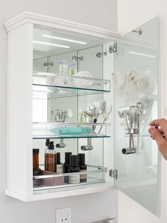 A mirrored medicine cabinet organizer maximizes functionality in small bathrooms by combining storage with a reflective surface. The cabinet provides dedicated compartments for medications, toiletries, and personal care items while its mirror helps create the illusion of a larger space.