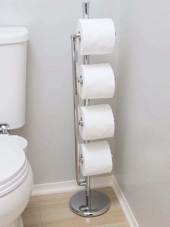 The stand typically accommodates up to 4 rolls and often includes a shelf for small bathroom items. Built with practical features like a weighted base for stability and rust-resistant materials, these stands combine functionality with modern design to enhance bathroom organization without sacrificing floor space.