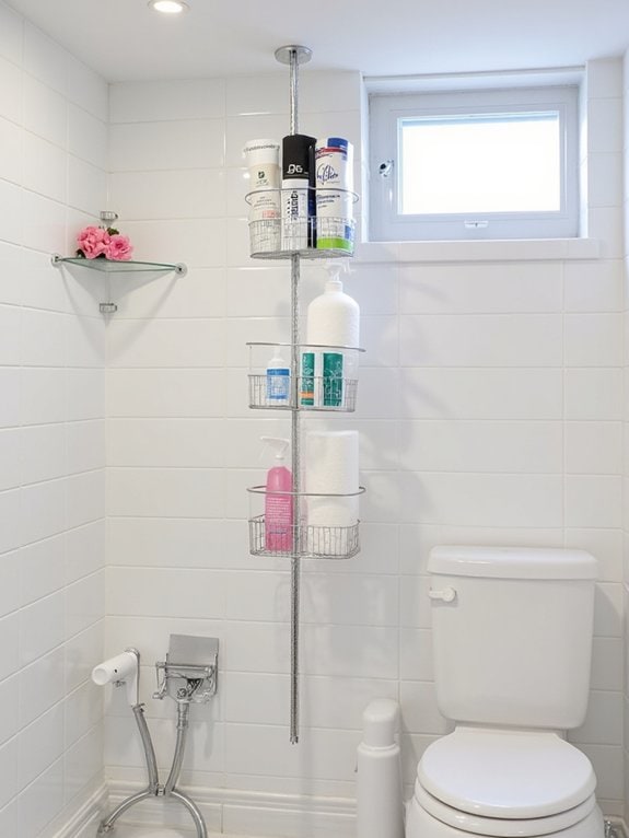 Adjustable tension rods offer versatile vertical storage solutions for tight bathroom spaces, requiring no permanent installation. These rods can be mounted between walls, cabinets, or shower enclosures to maximize otherwise unused areas.