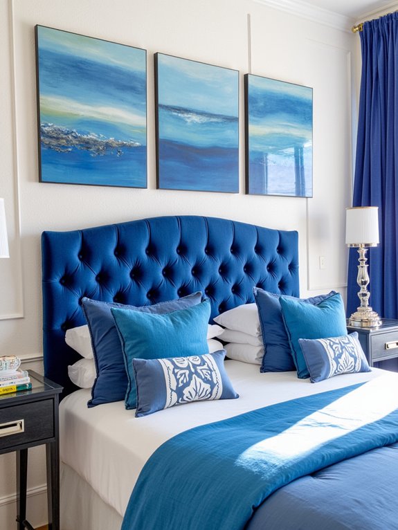A blue abstract canvas gallery creates a personalized art exhibition in the bedroom, featuring various shades and artistic expressions in blue. The arrangement transforms walls into a striking visual display while maintaining a harmonious color scheme throughout the space.