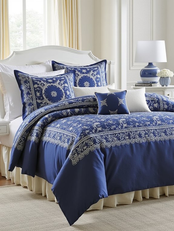 For optimal styling, combine the embroidered duvet with solid-colored Euro shams and coordinating throw pillows that echo similar patterns. The classic blue embroidery creates a timeless look that works harmoniously with various decor styles while providing rich textural elements that elevate the entire room’s design.