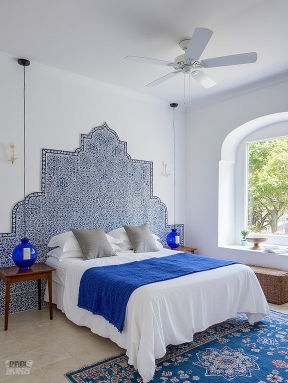 Mediterranean-inspired mosaic tiles in deep blues create an elegant coastal aesthetic in bedrooms. The intricate patterns and rich colors evoke the charm of European seaside villas while transforming walls into stunning focal points that promote relaxation and tranquility.