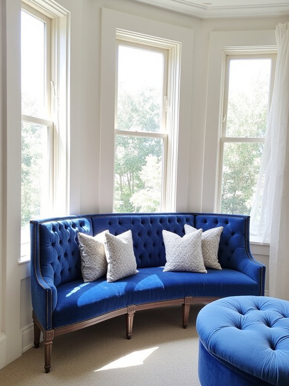 A luxurious blue velvet window bench serves dual purposes: creating an inviting reading nook while adding sophisticated style to bedroom decor. This statement piece maximizes previously unused window space and introduces an elegant accent to the room’s design scheme.
