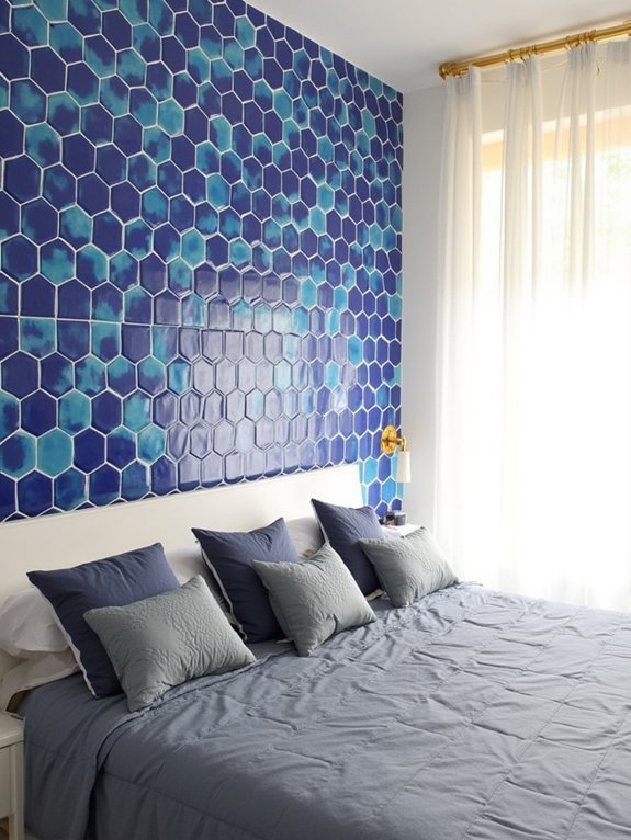 Geometric blue tile walls offer a sophisticated alternative to traditional painted surfaces, creating a stunning three-dimensional focal point in bedroom spaces. The strategic placement of tiles in various blue shades transforms walls into modern artistic displays, adding depth and visual intrigue that paint cannot match.