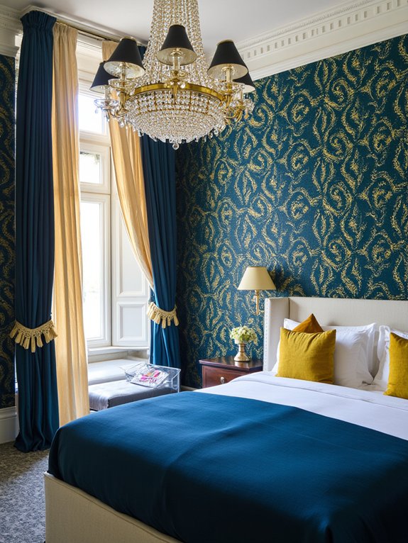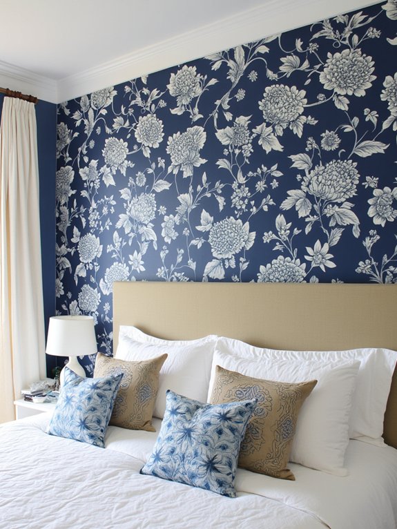 For optimal impact, the wallpaper should feature metallic accents to reflect light and add depth, while being limited to a single wall, typically behind the bed. To balance the bold pattern, surrounding furnishings should incorporate solid complementary blue tones that enhance the overall aesthetic without competing for attention.