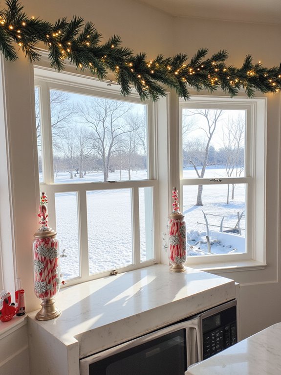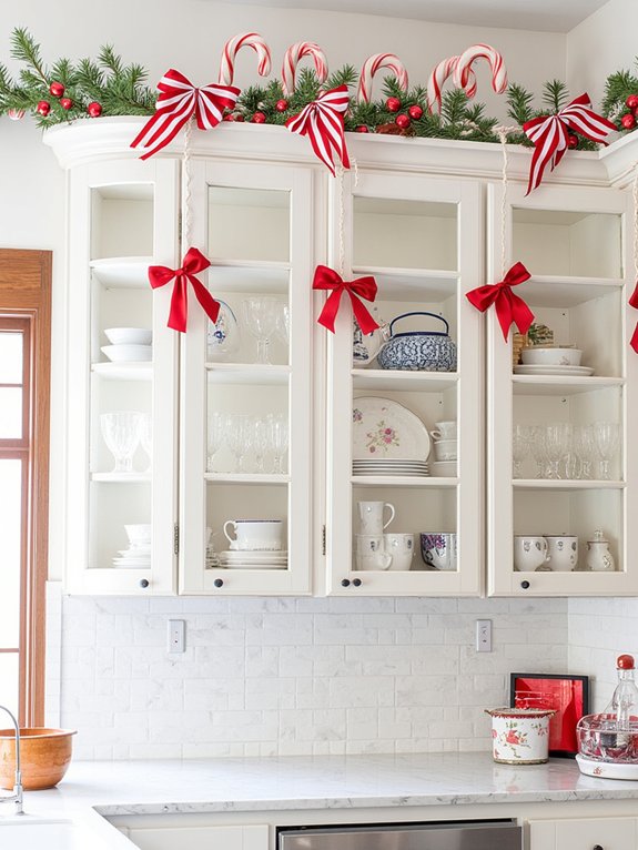 A candy cane garland creates a cheerful holiday display in any kitchen setting. This classic decoration features the iconic red and white striped candies that have been a Christmas tradition since the 1670s, transforming from simple white sticks to their modern striped design.