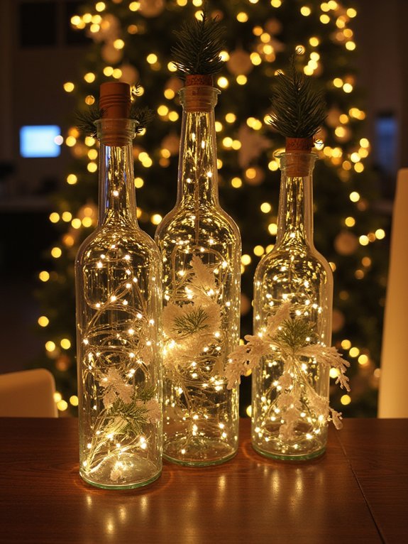 Transform the bottles by wrapping them in delicate fairy lights, adorning them with sparkling ribbons, and arranging them at varying heights. Enhanced with seasonal touches like ornaments, pine sprigs, and custom winter-themed labels, this elegant arrangement brings holiday magic to your kitchen while repurposing everyday items into conversation pieces.