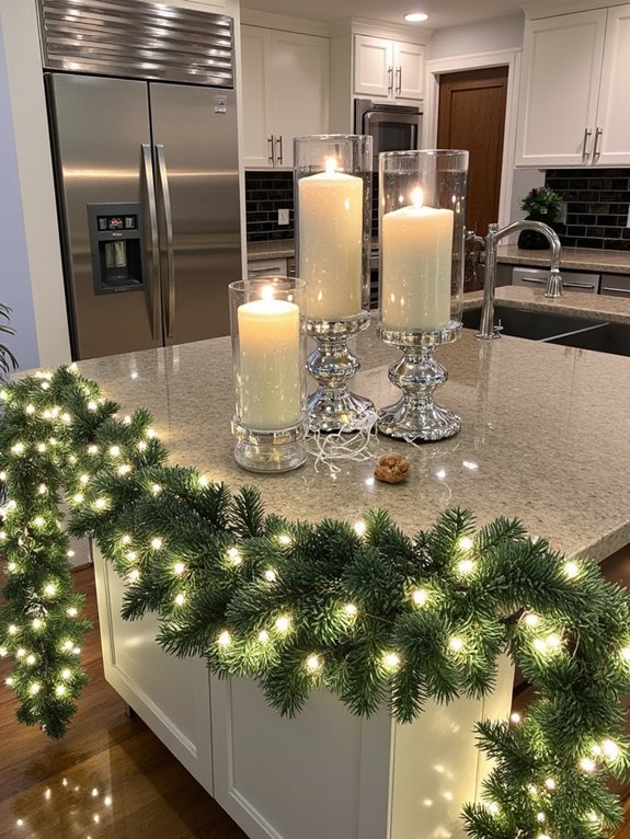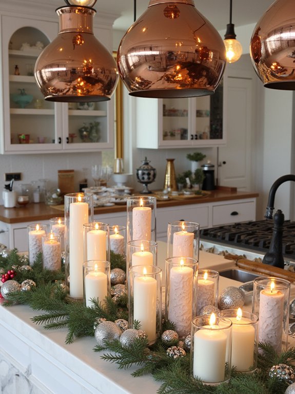 Glowing candle arrangements serve as enchanting focal points throughout the kitchen space, with strategically placed holiday-themed holders creating a festive atmosphere. Interior designer Sarah Chen emphasizes maintaining proper safety distances of 12 inches between flames while maximizing the decorative impact.