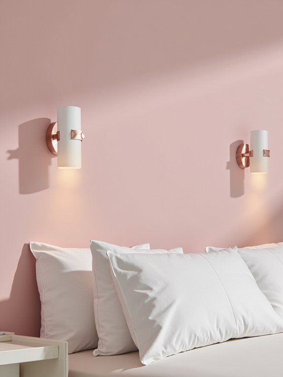 Pink minimalist wall sconces combine modern design with soft illumination, featuring clean lines and understated elements. These fixtures extend 4-6 inches from the wall and utilize frosted glass diffusers to create gentle, even lighting perfect for bedside reading and ambiance.