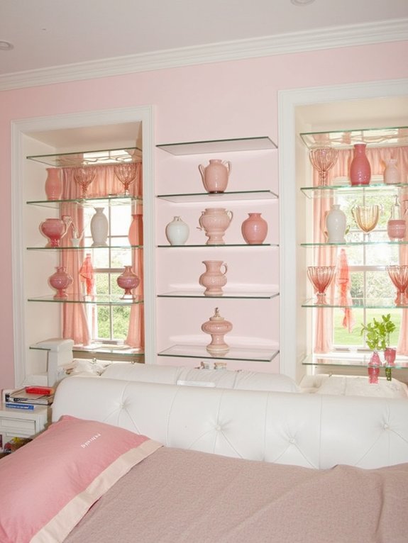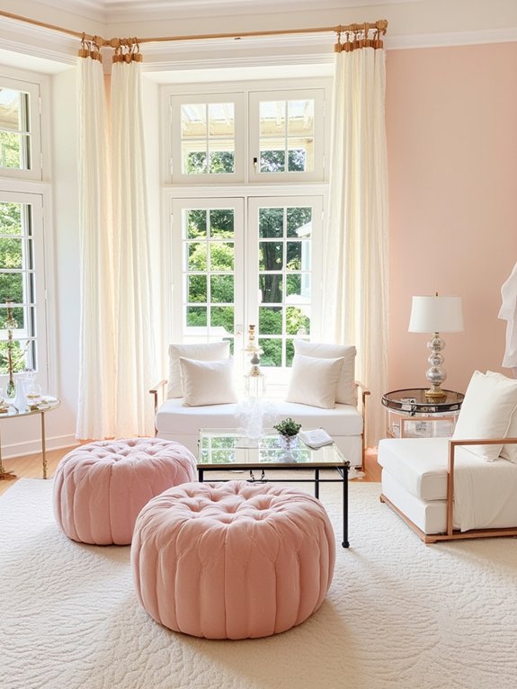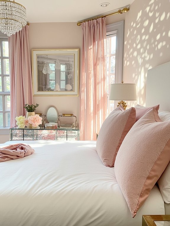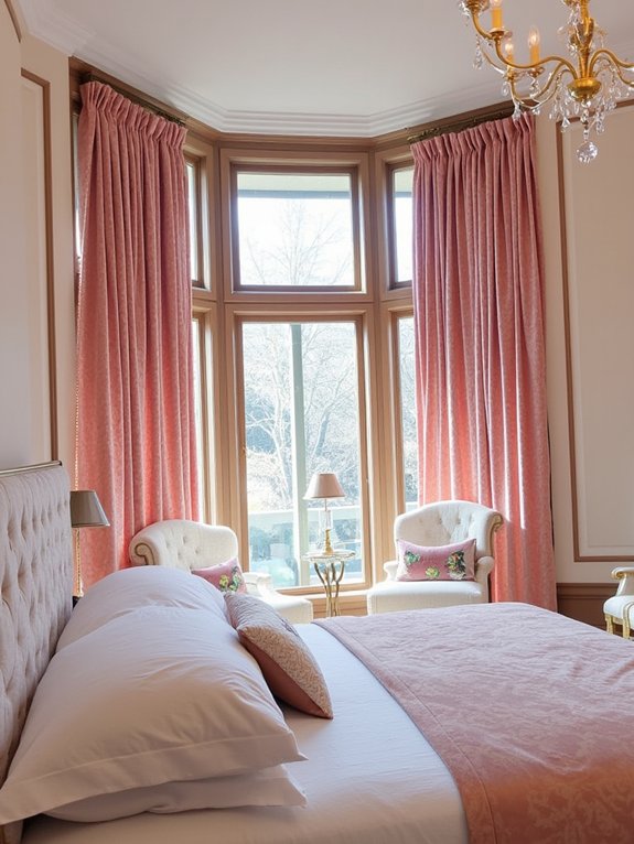 Floor-length panels create visual drama through their height and rich texture, while double-lined construction ensures optimal light control. Adding crystal or metallic tiebacks enhances the window’s decorative impact, and strategic panel placement above window frames maximizes the overall dramatic effect. These sumptuous treatments seamlessly blend form and function in pink bedroom designs.