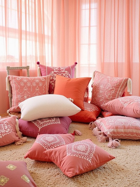 Pink Moroccan floor cushions create an inviting seating area in any bedroom corner, combining exotic style with comfort. Available in various sizes from large 24-inch squares to smaller decorative pieces, these plush accessories feature traditional patterns and tasseled details that add visual interest to modern spaces.