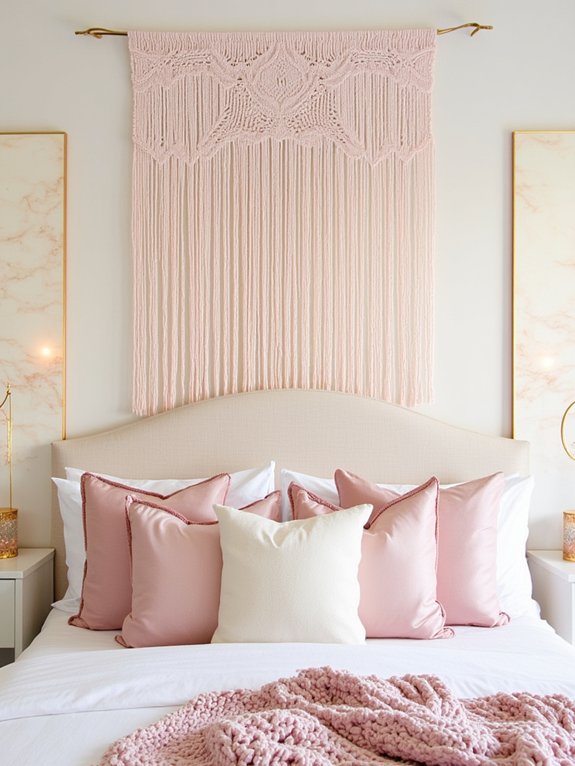 Handcrafted pink macramé wall hangings serve as striking artistic focal points in bedroom spaces. Through intricate knotwork, diagonal patterns, and flowing fringe details, these textile pieces add depth and bohemian charm to any wall they adorn.