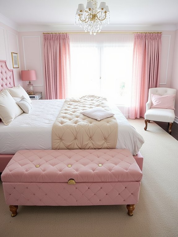 The pink quilted storage ottoman combines practicality with refined style, featuring elegant quilted patterns and hidden storage space beneath its lid. This versatile piece serves as both seating and storage while adding a sophisticated touch to bedrooms or living areas.