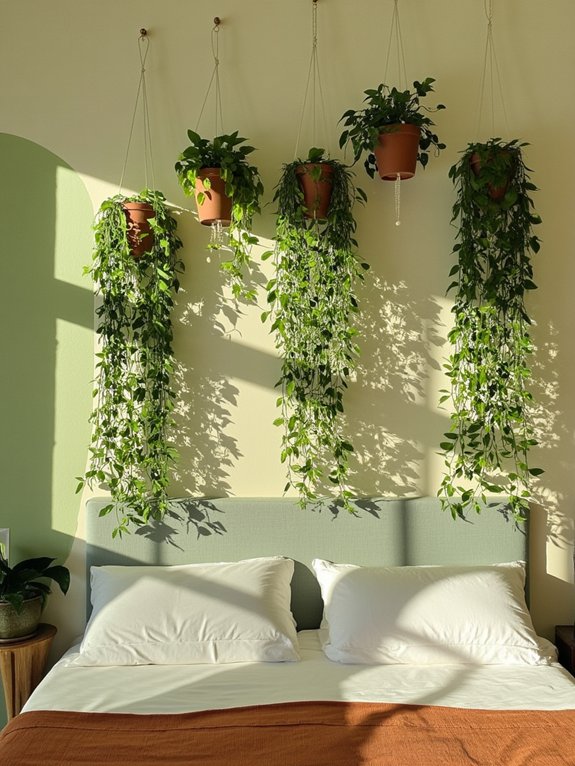 Hanging terracotta baskets filled with cascading plants create a stunning natural display in bedroom spaces. The earthy containers paired with trailing greenery transform the room into a serene hanging garden, adding vertical interest and organic beauty to the environment.