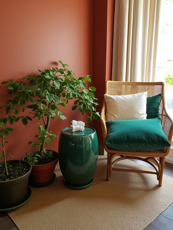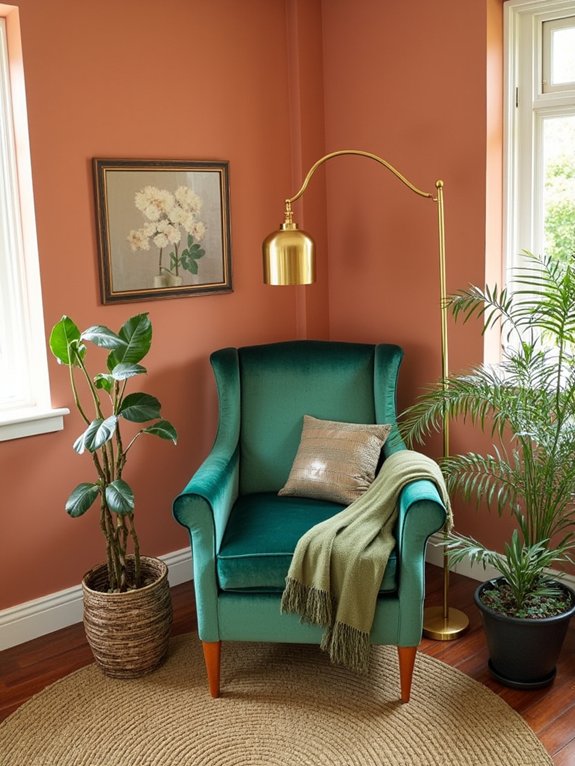 The space features plush emerald throw blankets casually draped over luxurious velvet accent chairs, creating an inviting spot perfect for curling up with a good book. A compact terracotta side table stands nearby, offering a convenient surface for reading materials and drinks.
